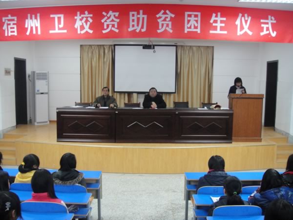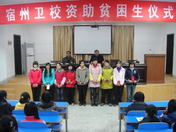 2009年12月8日下午,阴雨绵绵,寒气逼人,宿州卫校的学术报告厅里却座无虚席,处处充满了浓浓的春意。这里正在举行一场向特困生献爱心的捐助仪式。副校长陈永强、学生科科长孙宗波、校团委副书记张锋、学生科副科长王小蕊、周廷化等参加了捐助仪式。