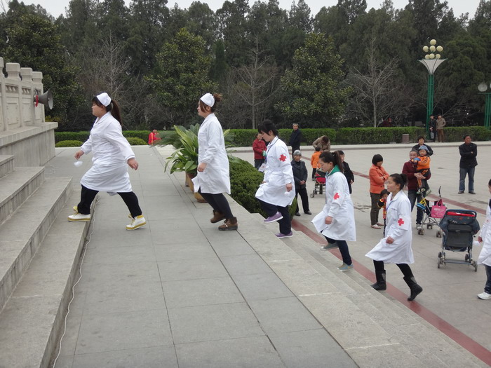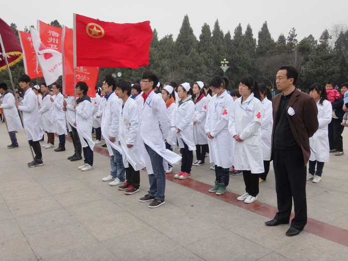 此次活动由校团委、校红十字会具体安排,校办室、学生科全力协助。校办公室主任、校党委秘书杨俊山,学生科周廷化科长,校团委书记张全亮、杨海波老师及65名学生干部一起参加了活动。上午9点,在校团委的统一安排下,同学们穿着整洁的护士服,头戴护士帽,乘坐校车前往位于宿州市内的雪枫公园,9点30分顺利抵达目的地。师生们手持白花,怀着沉痛的心情,举着花圈缓缓步入烈士陵园。眼前苍松翠柏郁郁葱葱,象征着革命精神永垂不朽;巍峨的烈士纪念碑,庄严高大,让人肃然起敬。彭雪枫将军扬鞭策马的塑像,雄壮威武,威风凛凛,又不乏儒雅之气,让人陡生敬意。