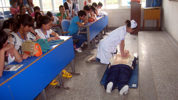 2012年6月4日下午4:40分,宿州卫校红十字会在北教101教室对新一批一年级救护队员进行了急救培训,培训主讲人为校三年级学生、校红十字会会员王云爱,校红十字救护队员、各班级红十字小组成员40余人参加了培训。此次活动旨在加强校红十字救护队员的急救意识,进一步增强其急救技能。