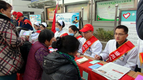 为了践行青年志愿者誓言,奉献公益爱心。在国际志愿者日12月5日,在团市委的统一组织下我院青年志愿者们与市立医院的医生一起,在银河绿苑小区开展义诊活动。