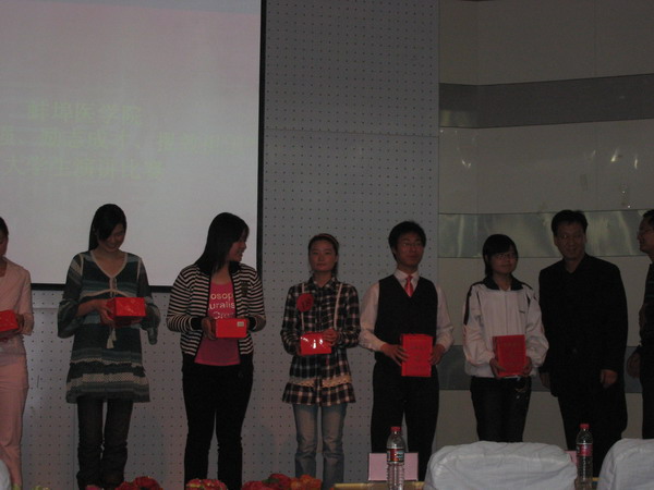 四月二十八日下午我校蚌医04班周丹同学代表我校进行角逐,她演讲的题目是“逆境成长、励志成才”,比赛中她发音准确、感情到位、沉着冷静,不因为有强大的对手而胆怯,受到了评委和在场观众的一致好评,最终取得了二等奖的好成绩。通过这次比赛主要是为了让同学们树立奋斗目标,努力学习,自强不息,成为国家栋梁。同学们现在就行动起来吧!