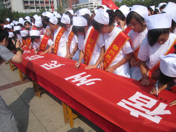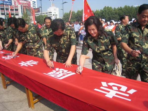 大会在上午九时准时开始,首先市民防办负责同志汇报民防志愿者救援总队组建情况,然后进行了庄严的授旗仪式,各学校代表和办事处代表先后上台接旗,最后省民防领导和市领导做总结讲话; 9时30分试鸣开始,会议结束后我校志愿者参加了签名仪式。