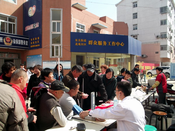 服务现场设立医疗咨询台,群众纷纷前来量血压、测血糖、咨询各种常见疾病的治疗与预防方法。我校韩伟智和武晓升俩位医生针对群众提出的各种问题都给予一一解答,并为他们检查身体健康情况。北苑小区有居民20000多,在我市算的上是一个比较大的居民区,学校工团组织相应团市委的号召,与北苑小区进行结对共建,结合医学院校特色,积极开展有意义的爱心帮扶活动,整个一天,前来咨询和检查的老人络绎不绝,志愿者们一边认真看病,一边还轻松的跟他们聊起了家常,了解他们生活近况和对社区服务的各种建议,老人们在轻松愉快的氛围度过闲暇时光。当天,志愿者们还在社区杨书记的带领下对小区内行动不便的居民开展上门义诊活动,并慰问了小区内的困难群众。
