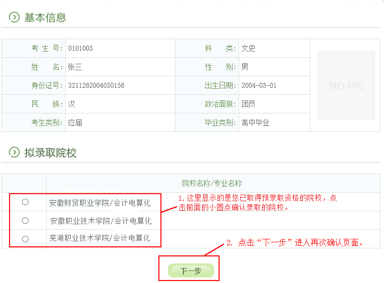 特别提醒:高职扩招录取确认只有在规定时间内(8月26日-27日),在规定网站(gkbm.ahzsks.cn)上操作方为有效。请各位考生一定要妥善保管自己的考生号、身份证号等个人信息,切勿泄露给其他人,更不要委托他人代替自己确认。一旦确认了录取院校,是不能修改的!!!