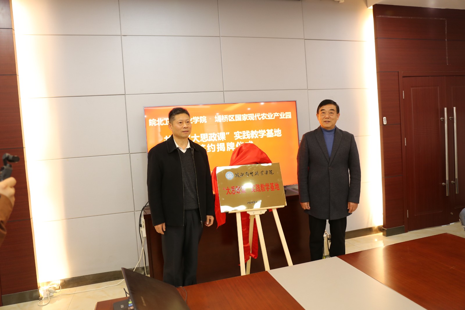 为进一步深化新时代高校思政课教学改革创新,充分发挥“大思政课”实践教学基地育人功能,2024年12月3日下午,我院与埇桥区国家现代农业产业园举行了“大思政课”实践教学基地签约暨揭牌仪式。学院党委书记解福来、党委副书记来景辉、党委工作部书记赵鹏飞、公共基础部党总支书记兼思政部主任张凯及部分师生代表参加了仪式。
