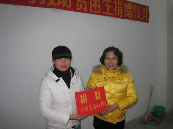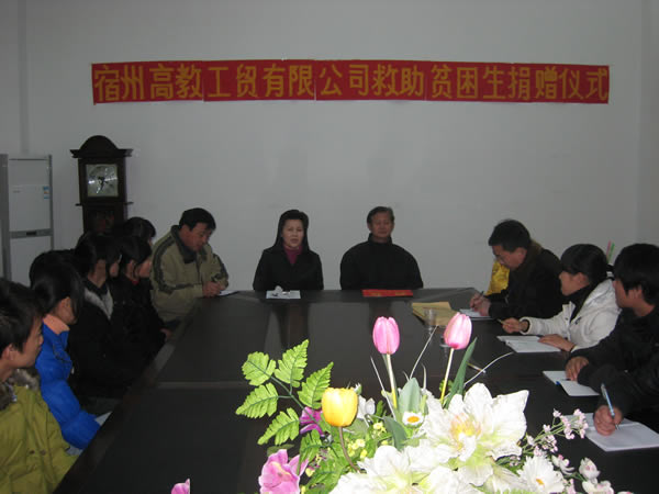 次次捐助凝聚关爱,涓涓细流汇成暖流。12月4日下午,宿州高教工贸有限公司救助我校贫困生捐赠仪式在学校二楼会议室隆重举行。高教工贸有限公司陶总把凝聚了工贸公司全体员工爱心的3500元救助金,亲手交到了受助学生代表手中,同时也把关爱之情传递到每位贫困学生心中。