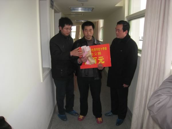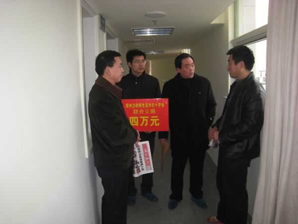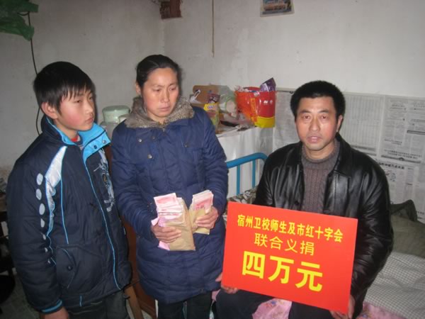 2月25日,宿州电视台《直播宿州》栏目报道了宿州卫校师生现场为本校身患白血病女生刘璐璐捐款3万多元的感人事儿。为把这笔爱心捐款及时送到刘璐璐手中,2月28日,该校党委委员梁永建带着校团委、校学生科等负责人驱车千余里赶到苏州大学附属第一人民医院,将学校及师生捐款和市红十字救助的共4万元现金交到了刘璐璐的父亲手中。