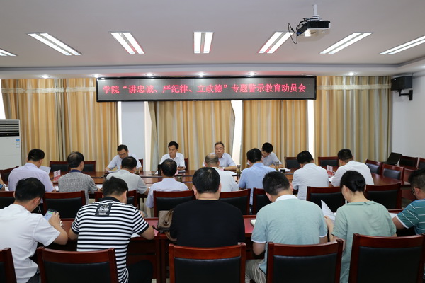 7月11日下午3时,学院“讲忠诚、严纪律、立政德”专题警示教育动员会在二楼会议室召开,院党委领导班子、副科级以上党员干部、学院各基层党组织书记参加动员会。