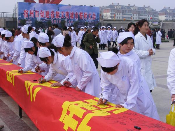 我校作为市卫生系统的重要组成单位,也派出了60位同学,在杨俊山主任的带领下参与了这次大会。在大会期间,我校同学表现突出,秩序井然,出色的完成了任务,向社会展示了宿州卫生学校学生的风貌,得到社会的好评!图