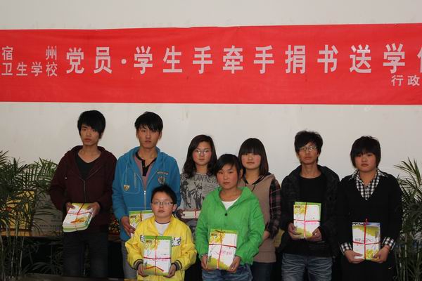 在创先争优活动进入全面推进阶段之际,宿州卫校行政党支部结合学校实际,围绕教育工作中心,于3月28日下午发起“党旗下牵手”——结对帮困、捐书送学活动。行政党支部与帮扶学生结对子,相约从学习、生活、思想上关爱他们,帮助他们树立正确的人生观、价值观,克服生活上的困难和心理上的障碍,实现在校期间的健康成长。